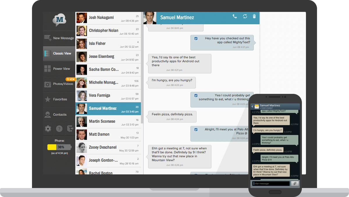 Jump to SMS Text Messaging Texting SMS - You can easily send and receive text messages anywhere within India without any extra cost and without .... Download SMS Text Messaging ↔PC Texting Apk For Android. 3:00 PM. Unknown. Save Battery Life: Our app helps save battery – because you can send SMS .... Download free MightyText 15.26 for your Android phone or tablet, file size: 4.39 MB, was updated 2019/22/12 Requirements:android: 4.4 Kitkat or above.. The mysms family of applications helps you text anywhere and enhances your messaging experience on your smartphone, tablet and computer.. You are downloading SMS Text Messaging -PC Texting 15.10 APK file for Android smartphones/tablets which requires Android 2.3.2, Android 2.3.1, Android 2.3 .... LINE is a new communication app which allows you to make FREE voice calls and send FREE messages whenever and wherever you are, 24 hours a day!. Text From Any Device. Send & receive SMS and MMS from your computer or tablet, using your current Android phone number. Messages stay in sync with your ... 3d2ef5c2b0